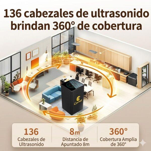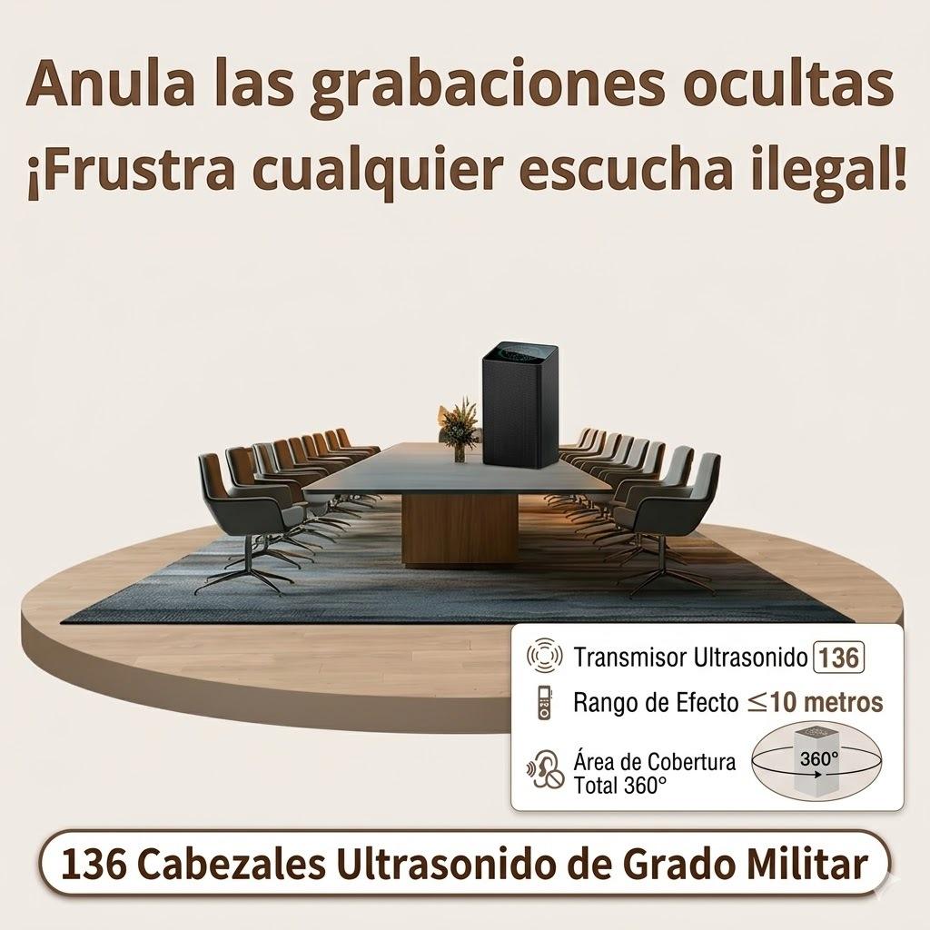 Este equipo profesional integra 136 transductores ultrasónicos de última generación. Cubre 360 grados con un radio de hasta 8 metros lineales para una superficie estimada de 30 metros cuadrados .Sus sonidos de alta y baja frecuencia interrumpen el procesamiento de la voz y bloquean incluso grabaciones codificadas.