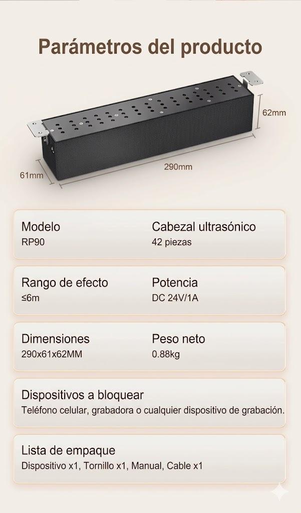 tecnología avanzada: 42 cabezales ultrasónicos brindan protección integral contra dispositivos de grabación.