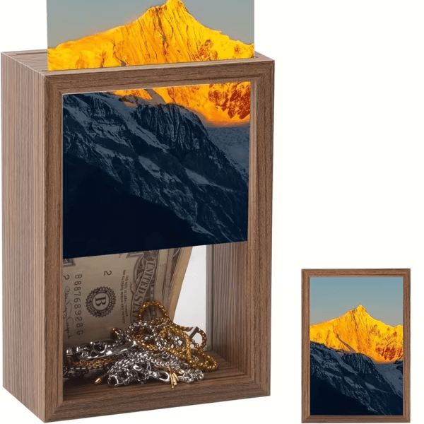 Eleva el arte de la decoración y la seguridad a un nivel completamente nuevo con nuestro Marco de Fotos Secreto «Pico Dorado». A simple vista, es una obra de arte impresionante que captura la belleza majestuosa de una montaña bajo la luz dorada del amanecer. Pero debajo de esta impresionante fachada se esconde un secreto ingenioso: un compartimento privado diseñado para proteger lo que más valoras.